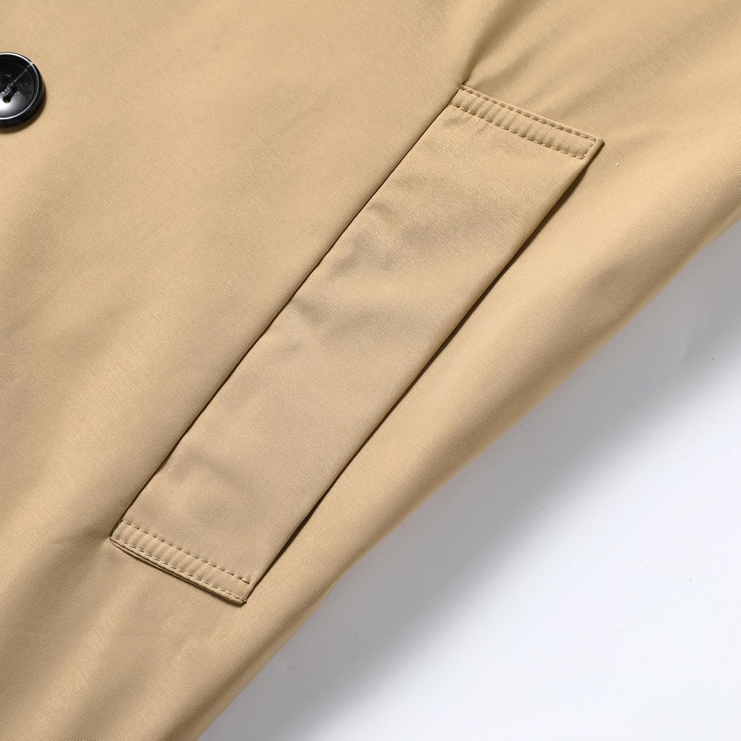 Diese Rezension bezieht sich auf den Artikel «Allthemen Herren Trenchcoat Zweireihig Mantel Herbst Jacke Business Casual Übergangsjacke Mittellang Coat Winddicht» (ASIN: B0FJ5QDTTR), den ich als «Vine-Voice» testen durfte (s.u.).Der Mantel oder die Jacke wird in einer Plastiktüte geliefert und ausweislich der Verpackung in China hergestellt. Das Material ist außen wie innen leider zu 100 % synthetisch (Polyesterfasern), daher nur bedingt atmungsaktiv, aber als «Ãœbergangsjacke» ganz okay. Der Stoff ist weich, wirkt aber schmutzabweisend, er ist deutlich dünner als man es von klassischen Trenchcoats kennt und geschmeidiger, als ich anhand der Bilder erwartet hätte.Sonderlich warm ist die Jacke nicht, der Stoff sehr leicht, das Innenfutter ebenso – eben ein elegant geschnittener Wetterschutz für die Stadt, nichts für lange Spaziergänge im Wald. An der Verarbeitung gibt es nichts auszusetzen, Knöpfe und Nähte sind da, wo sie hingehören. Die beiden Taschen sind nicht verschließbar, innen gibt es nur links eine Innentasche, leider auch diese ohne Reißverschluss oder Knopf.Der Schnitt entspricht, obwohl optisch am Kragen und hinsichtlich der Rückenklappe an einen Trenchcoat oder Mantel erinnernd, eher gewöhnlichen halblangen Übergangsjacken. Also deutlich kürzer, als ein Mantel oder Trenchcoat wäre! Hatte ich mir anhand der Fotos etwas länger vorgestellt.Die Größe fällt etwas knapper aus als erwartet: Eine Jacke von C&A, die mir etwa gleich gut passt wie diese in «XXL» bestellte, hat die Größe 56 / «XL» – daher dürfte diese hier m. E. ruhig noch etwas weiter ausfallen (gerne wie oben erwähnt auch etwas länger, wobei die Ärmellänge OK war); schließlich trägt man sie, anders als «normale» Jacken, vielleicht auch mal über einem Jackett oder Anzug.-.-.-.-PS: Amazon hat mir den Artikel zur Verfügung gestellt, um ihn ehrlich und unvoreingenommen zu rezensieren und anderen Kunden bei der Kaufentscheidung zu helfen. Ich bewerte stets so, als hätte ich den Artikel regulär gekauft, berücksichtige in der Sternevergabe allerdings nicht den Preis, da er sich jederzeit ändern kann.