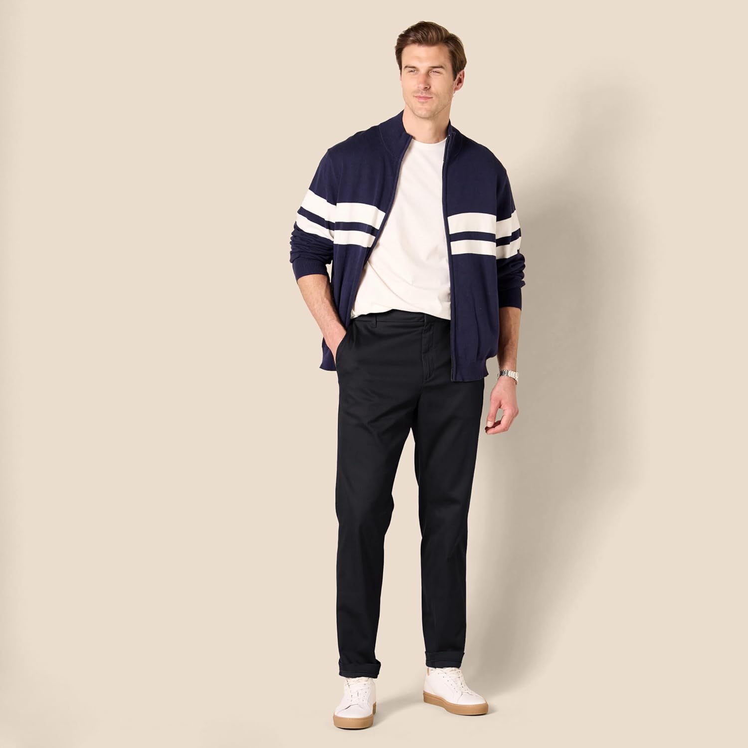Ho preso questi pantaloni per provare questo stile differente dai classici di Amazon Basic, dei quali posseggo diversi paia.Questi chino sono a trama liscia, elasticizzati il giusto per renderli molto comodi nella calzata, leggermente giusti in vita in base alla taglia mia solita. La colorazione mi piace molto così come le tasche sufficientemente capienti per smartphone o portafogli.Le uniche pecche riscontrate sono la leggerezza (intesa come protezione dal freddo) in quanto d’inverno sono sconsigliati da utilizzare, nonostante io sia piuttosto caloroso ed utilizzi pantaloni e jeans semplici per i mesi freddi. L’altra è il bottone in vita, in quanto hanno un sistema differente composto da una linguetta metallica ed un bottone rivolto verso l’interno, che nel mio caso, essendo giusti di misura, risulta un po’ più scomodo del classico esterno.Detto ciò li consiglio comunque perchè sono molto comodi e la taglia acquistata è corretta per le mie misure, lo stile mi piace molto e li sfrutterò molto nei futuri mesi primaverili.