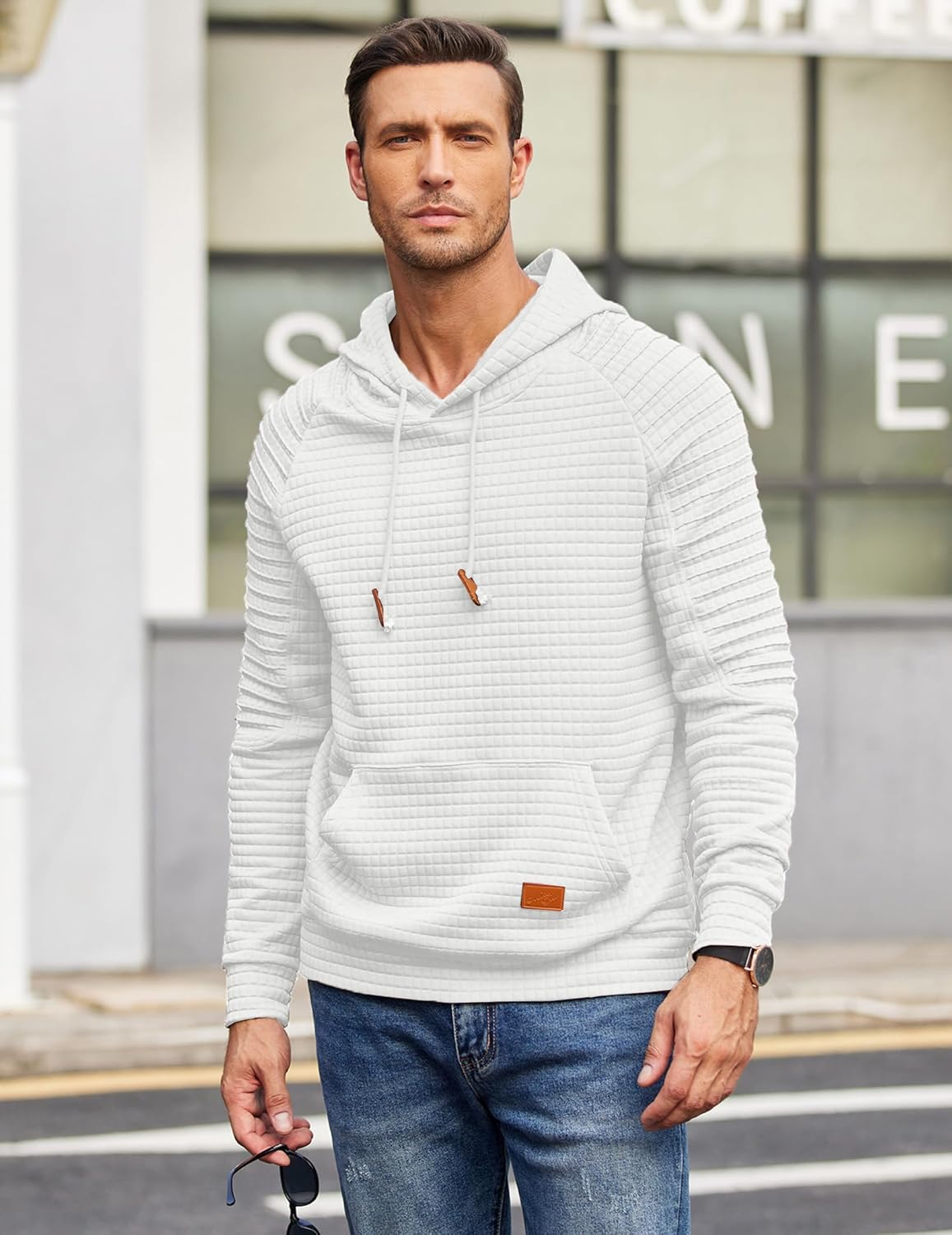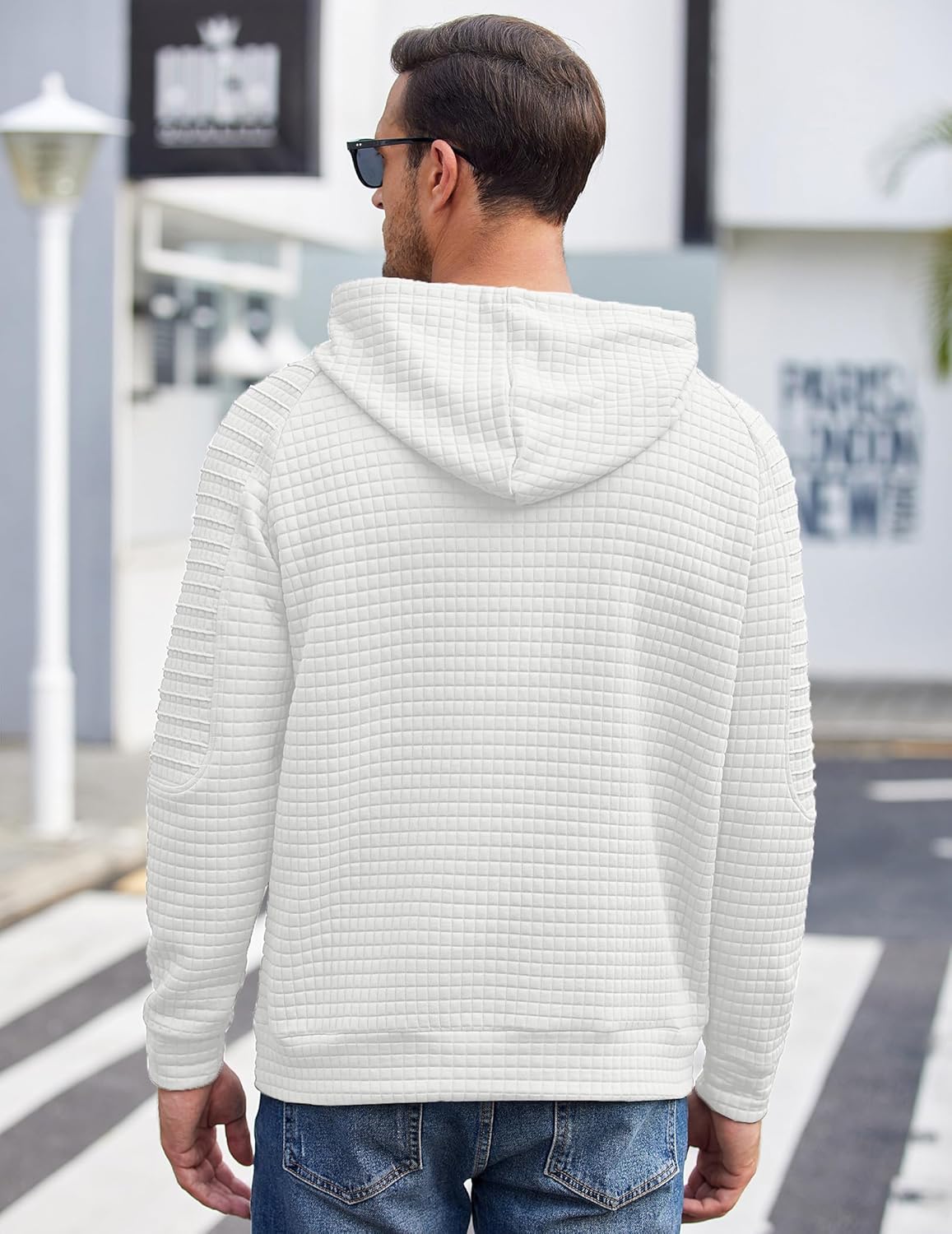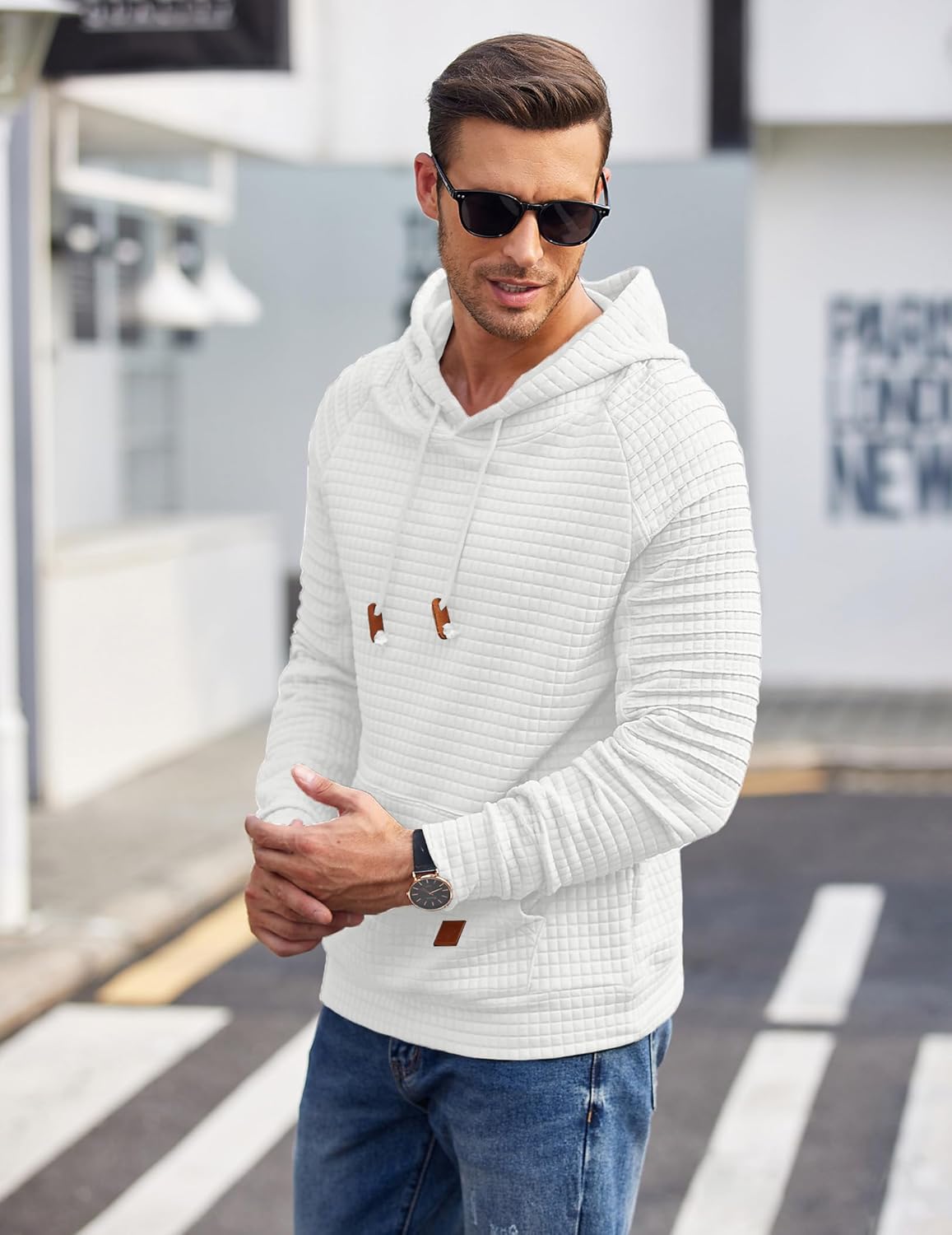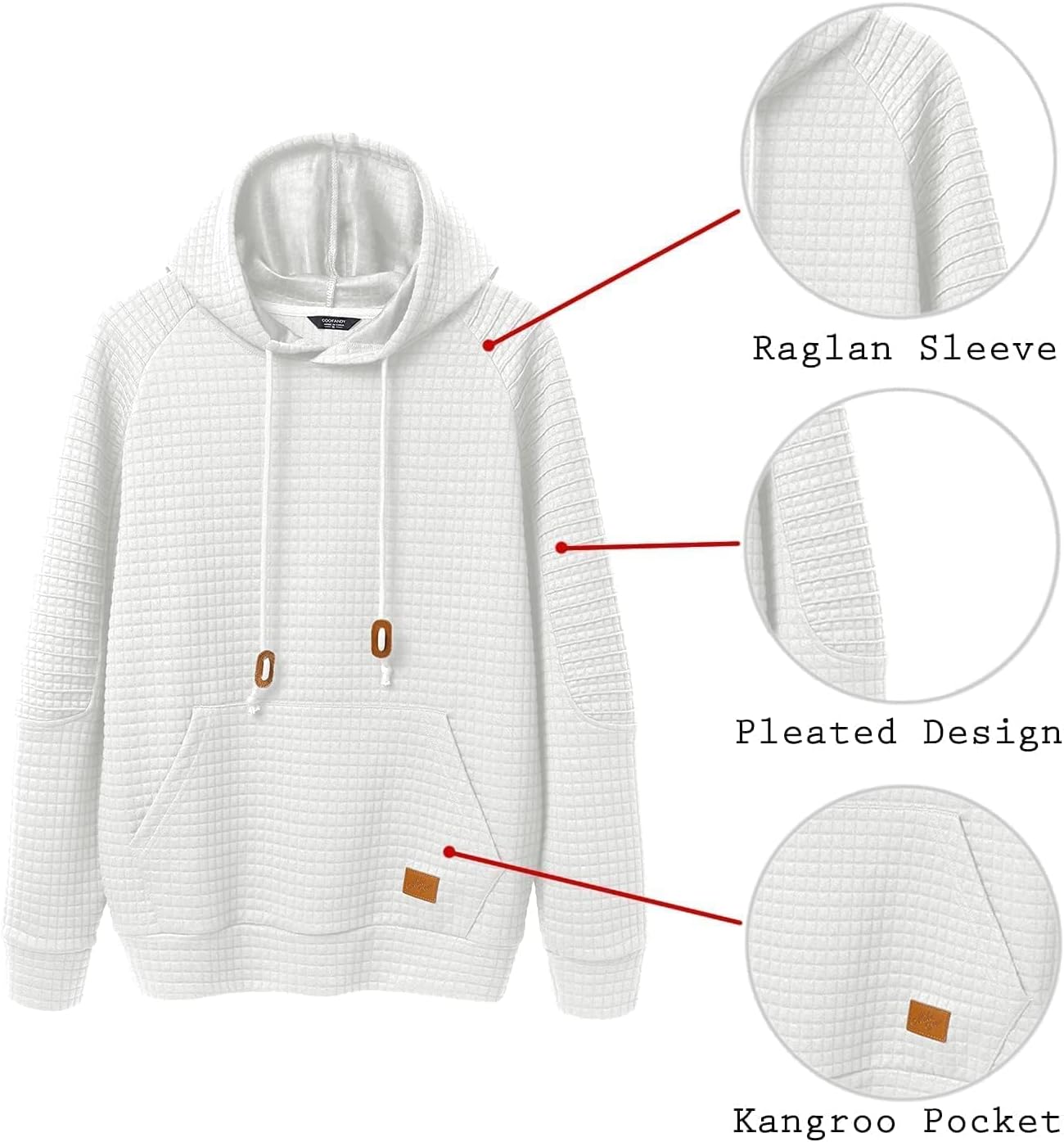 The hoodie has ties to adjust and against the cold. The ribbed hem and cuffs fit the body better. Simple and simple design, long sleeve, waffle pattern, drawstring hoodie.
