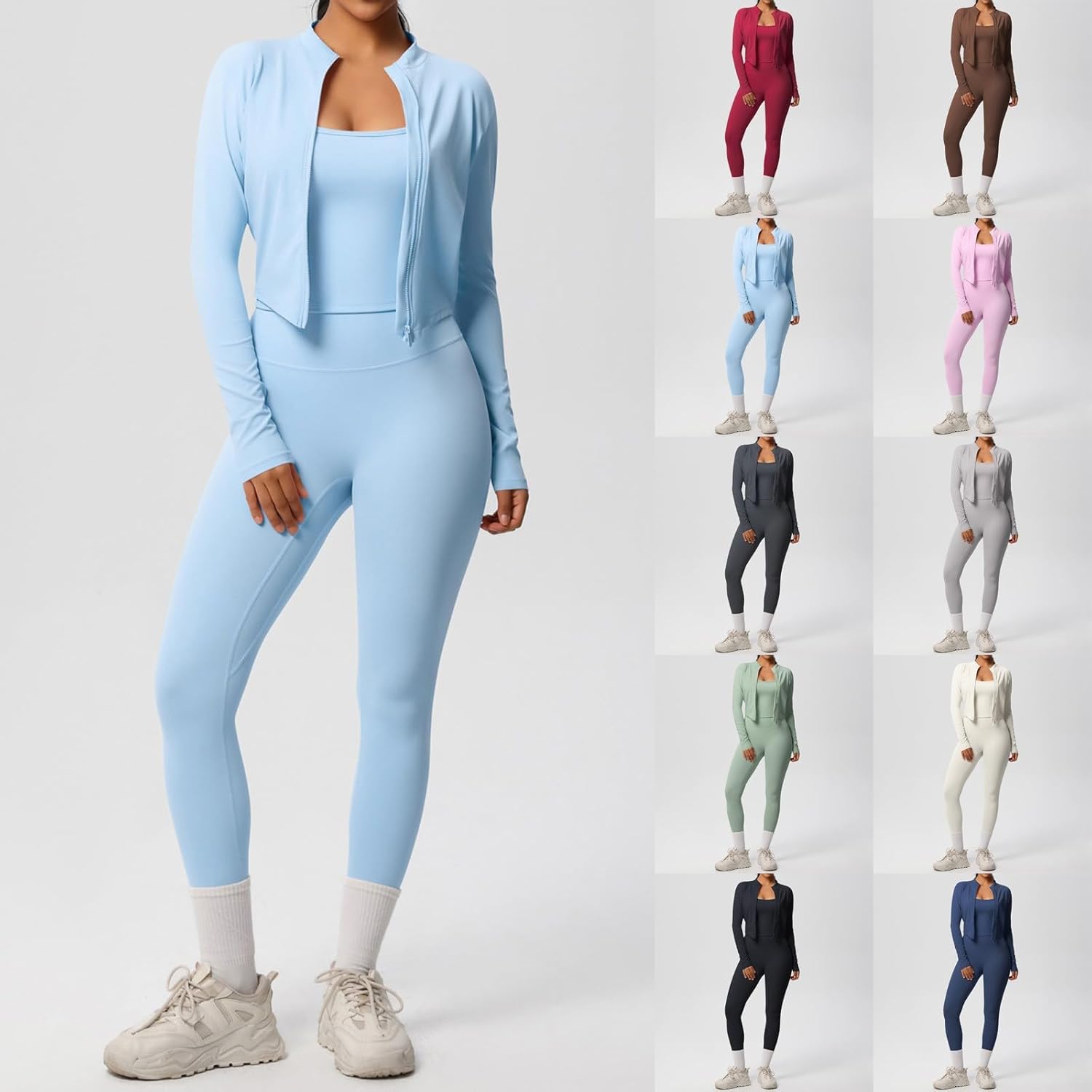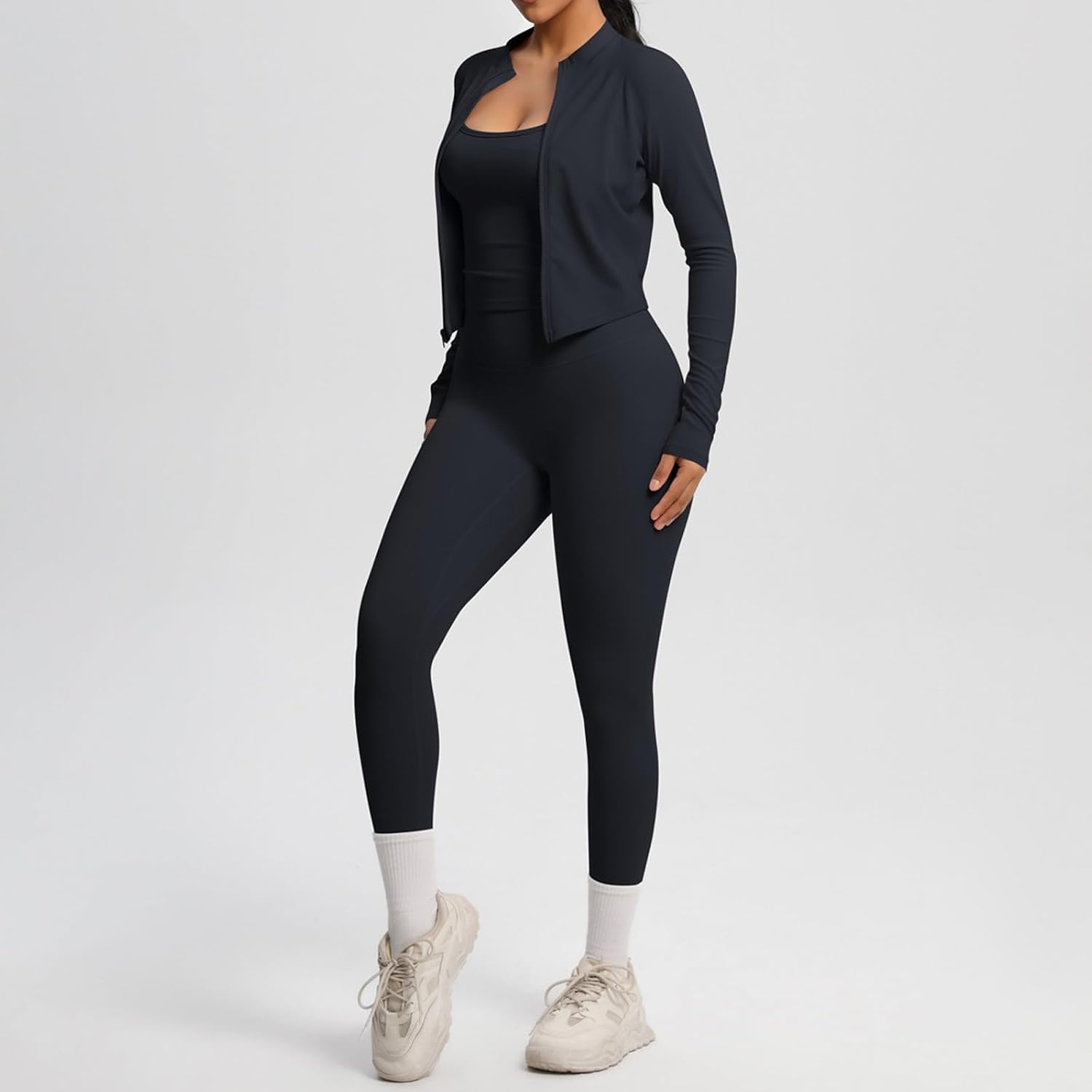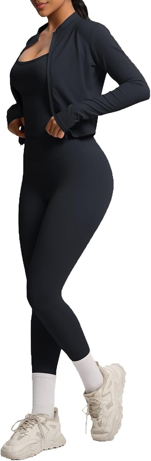 Genérico Women’s Tracksuit Set Yoga Top Short Fitted Long Sleeve Fitness Jacket Running Tights Leggings 3 Piece Set Breathable Sports Set