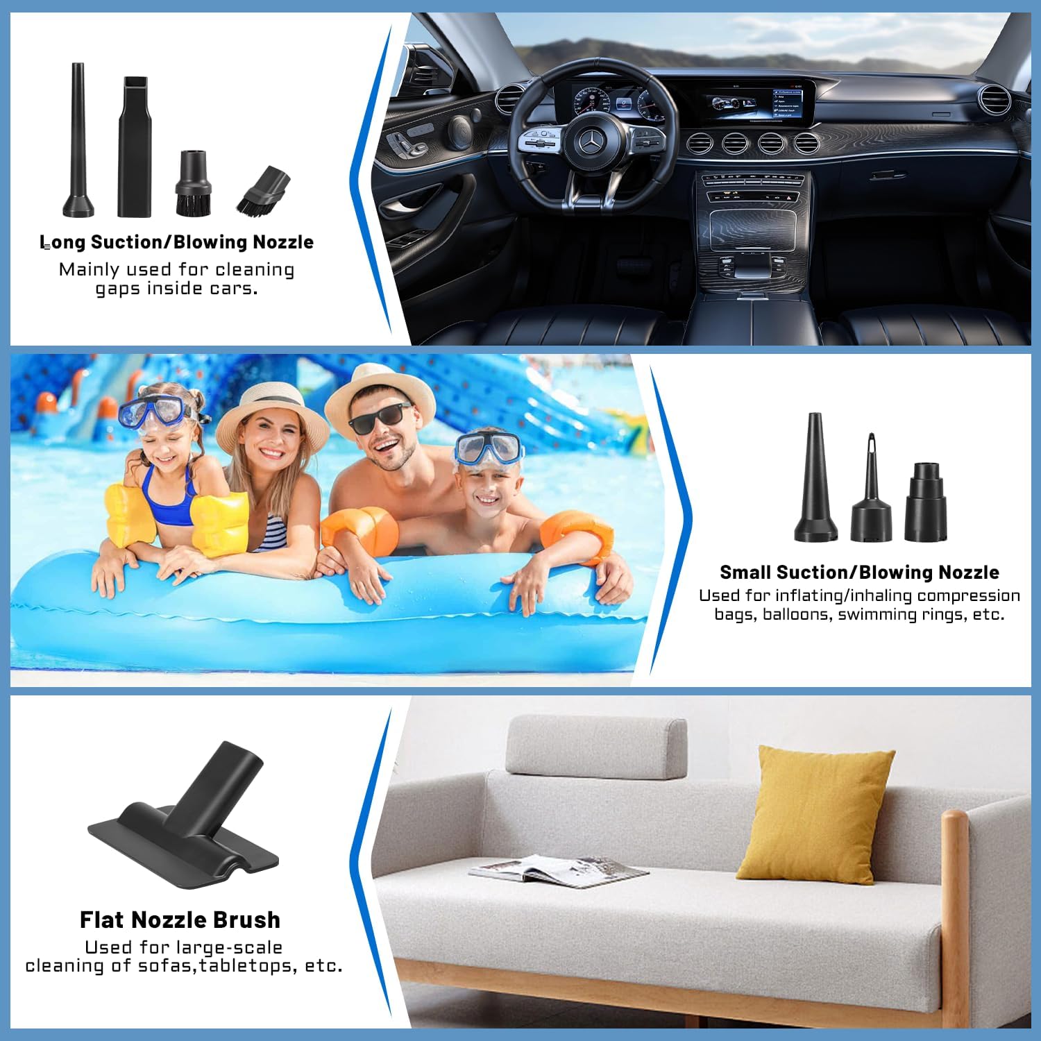 MULTIFUNCTIONAL CLEANING – This powerful car vacuum cleaner has eight interchangeable nozzles for vacuuming, blowing, inflating and vacuuming. It is ideal for daily cleaning in cars, apartments and offices. For example, it can be used to remove dust from corners and seats, inflate balloons and floats, as well as to vacuum storage bags.