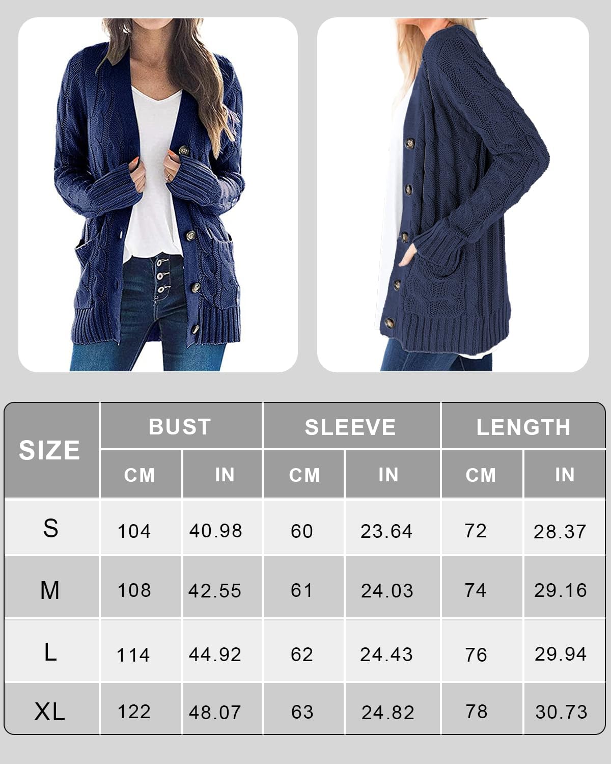 Cómodo y calentito, para el frÃo, se siente bien hecho el color es muy bonito, mi novia está encantada con el cardigan.
