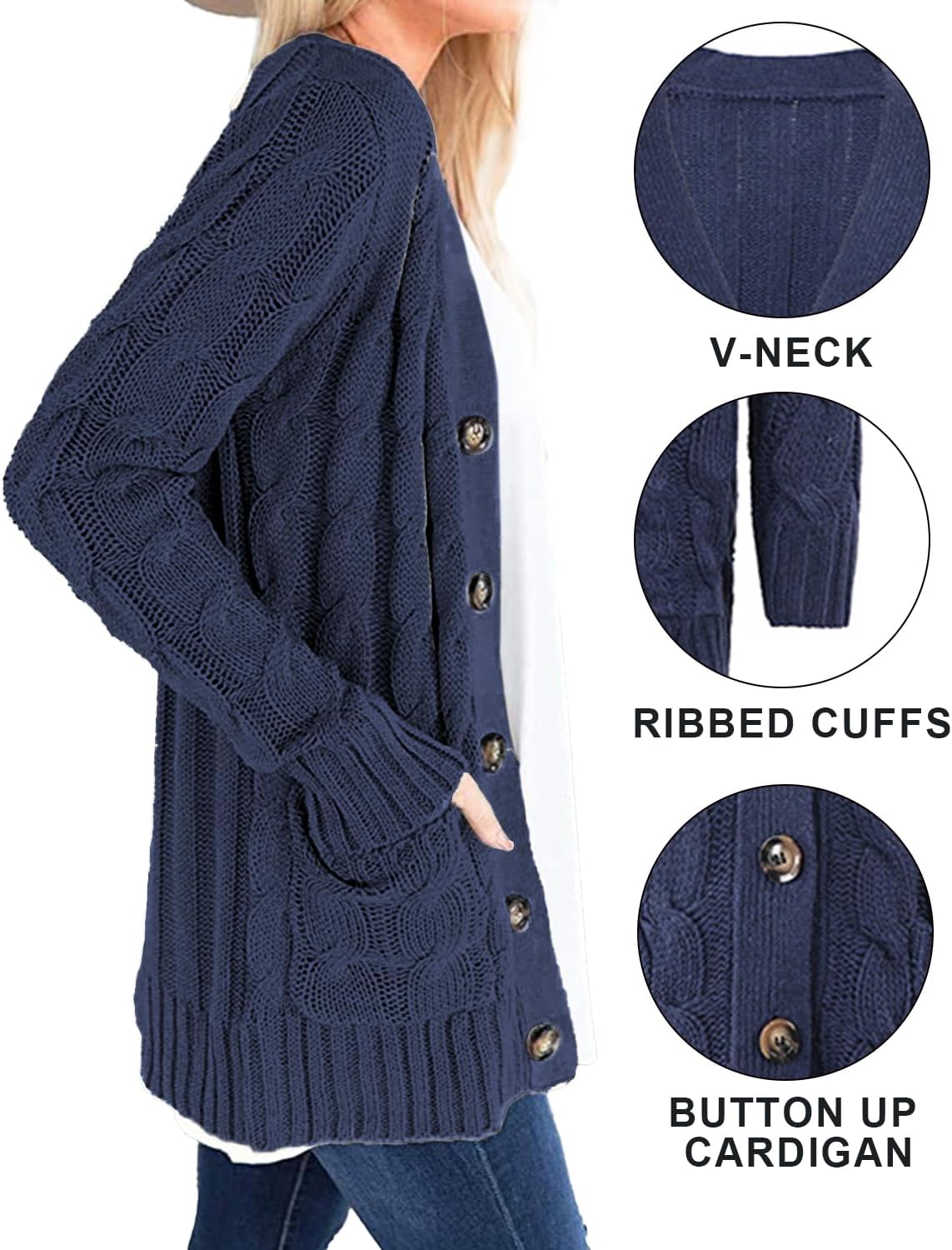 Cardigan bleu avec 2 poches et de jolis boutons, 80% polyester, 20% coton. Assez long pour cacher les formes. Tient bien chaud. Taille parfaitement bien. Bon rapport qualité prix. Tellement contente de mon achat je m’en suis commandé un autre