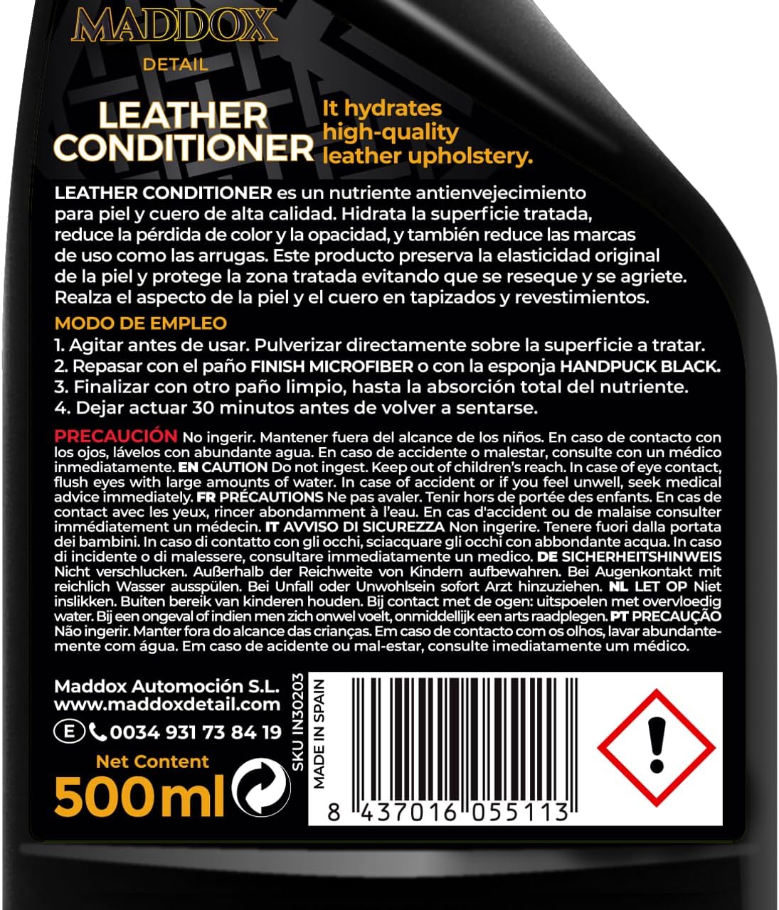 Recientemente adquirà el Maddox Detail – Leather Conditioner con la esperanza de revitalizar los asientos de cuero de mi coche. A pesar de las promesas de hidratación y rejuvenecimiento del cuero, mi experiencia ha sido más frustrante que satisfactoria.🔹CALIDAD Y APLICACIÓN🔹👠LO QUE MÃS ME HA GUSTADO:+ Fácil aplicación ➤ El formato en spray facilita la aplicación, aunque el pulverizador podrÃa ser de mejor calidad para distribuir el producto de manera más uniforme.👎 LO QUE MENOS ME HA GUSTADO:- Resultados Inconsistentes ➤ Tras seguir cuidadosamente las instrucciones, el producto dejó zonas de distinto color en la piel y resaltó las imperfecciones en lugar de disimularlas.- Aspecto Final Poco Deseado ➤ En lugar de un acabado mate natural, los asientos quedaron con un brillo artificial y sensación grasosa al tacto.🔹EFICACIA Y RENDIMIENTO🔹👎 LO QUE MENOS ME HA GUSTADO:- Hidratación Dudosa ➤ Contrario a lo que se promete, dudo que este producto nutra efectivamente el cuero. Los asientos no mostraron signos de mejora en su condición o flexibilidad.- Problemas con el Envase ➤ Algunos usuarios han reportado que el producto llegó derramado o con el pulverizador defectuoso, lo que complica aún más su uso.🔹PRECIO Y VALOR🔹👎 LO QUE MENOS ME HA GUSTADO:- Relación Calidad-Precio ➤ Considerando los resultados obtenidos, el precio del Maddox Detail – Leather Conditioner se siente excesivo. Hay opciones más económicas en el mercado que ofrecen mejores resultados.🔹CONCLUSIÓN🔹Aunque tenÃa grandes esperanzas en el Maddox Detail – Leather Conditioner, los resultados han sido decepcionantes. La inconsistencia en el acabado y la falta de una verdadera hidratación no justifican su precio. RecomendarÃa buscar alternativas más efectivas y económicas para el cuidado del cuero. Mi búsqueda de un producto adecuado para mis asientos de cuero continúa.