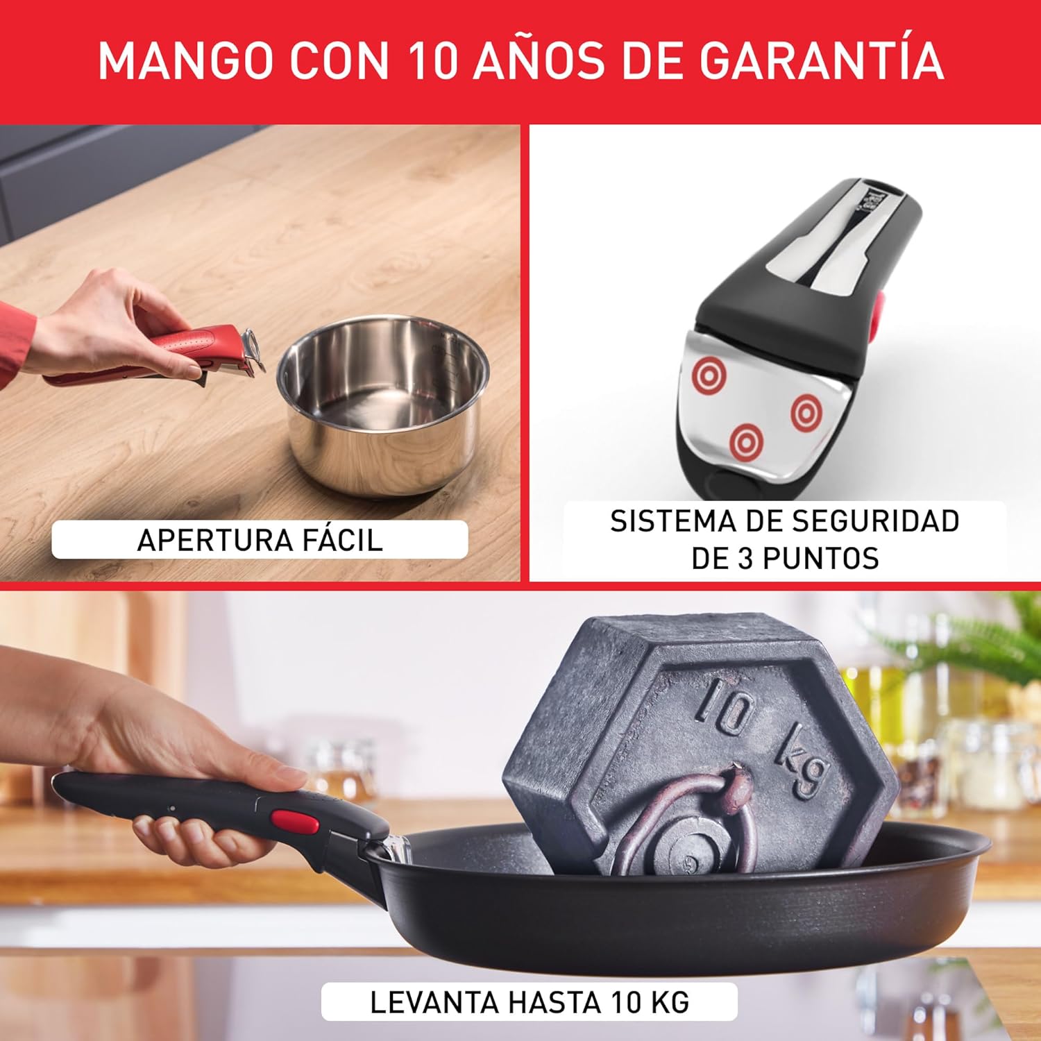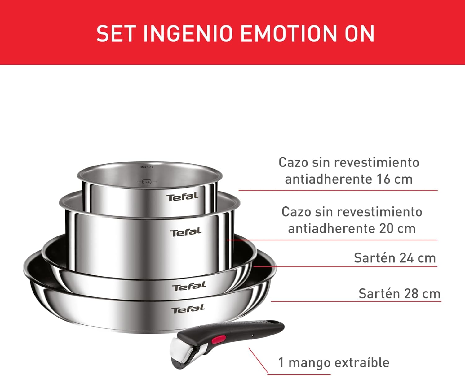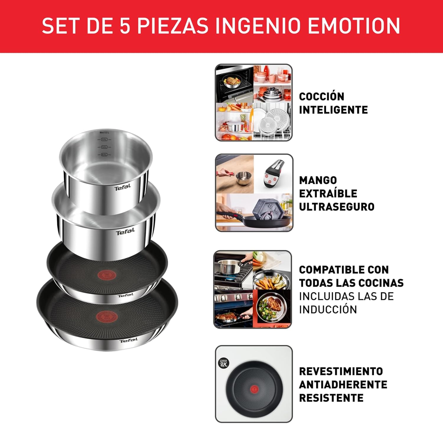 Desde que adquirà este set de sartenes, mi experiencia en la cocina ha mejorado notablemente. El mango extraÃble es una maravilla: me permite ahorrar espacio en los armarios y facilita su uso tanto en la cocina como al servir los platos.Lo que más me gusta:Versatilidad: El mango se coloca y retira con facilidad, permitiendo usar las sartenes en el horno (hasta 250°C) y en el lavavajillas sin complicaciones.Revestimiento antiadherente de titanio: Cocinar sin que los alimentos se peguen es un placer, y la limpieza posterior es rápida y sencilla.TecnologÃa Thermo-Signalâ„¢: El punto central se vuelve rojo cuando la sartén alcanza la temperatura ideal, evitando sobrecalentamientos y asegurando una cocción perfecta.Compatibilidad total: Aptas para todo tipo de cocinas, incluyendo inducción, gas, eléctrica y vitrocerámica.Un pequeño detalle a considerar:Aunque el mango es muy práctico, es recomendable retirarlo antes de utilizar las sartenes en el horno para evitar posibles daños.En resumen, el Tefal Ingenio Emotion es una inversión que facilita la cocina diaria, ahorra espacio y ofrece resultados de calidad.