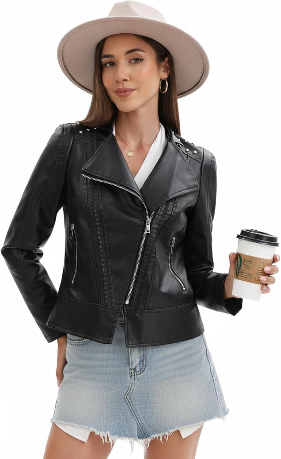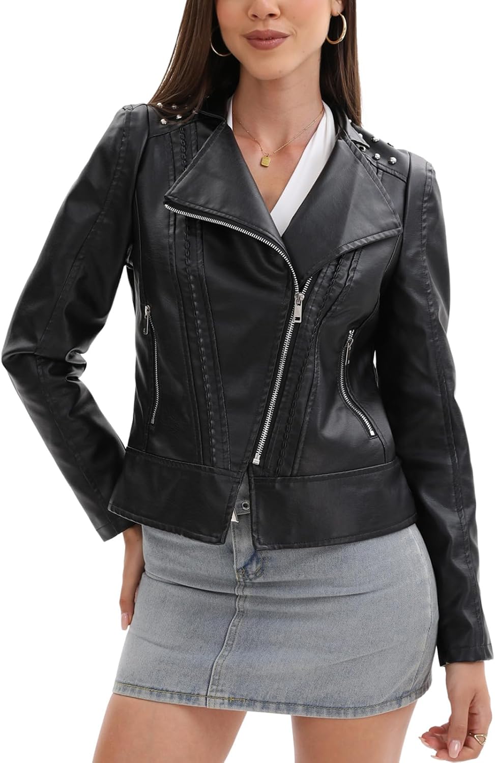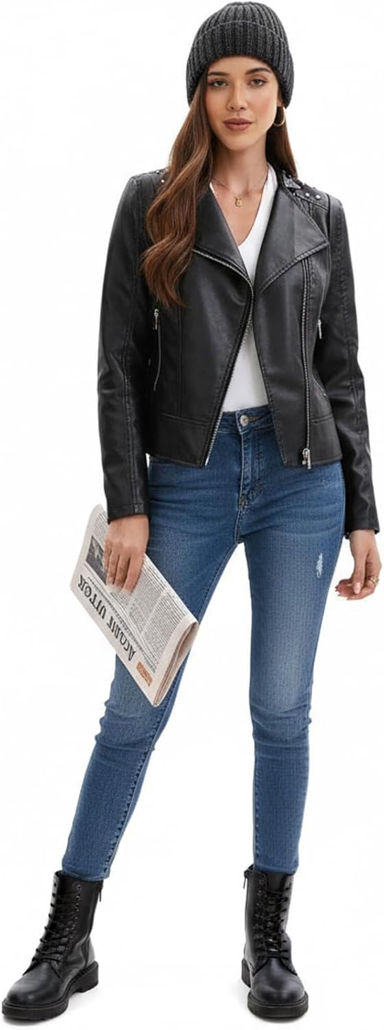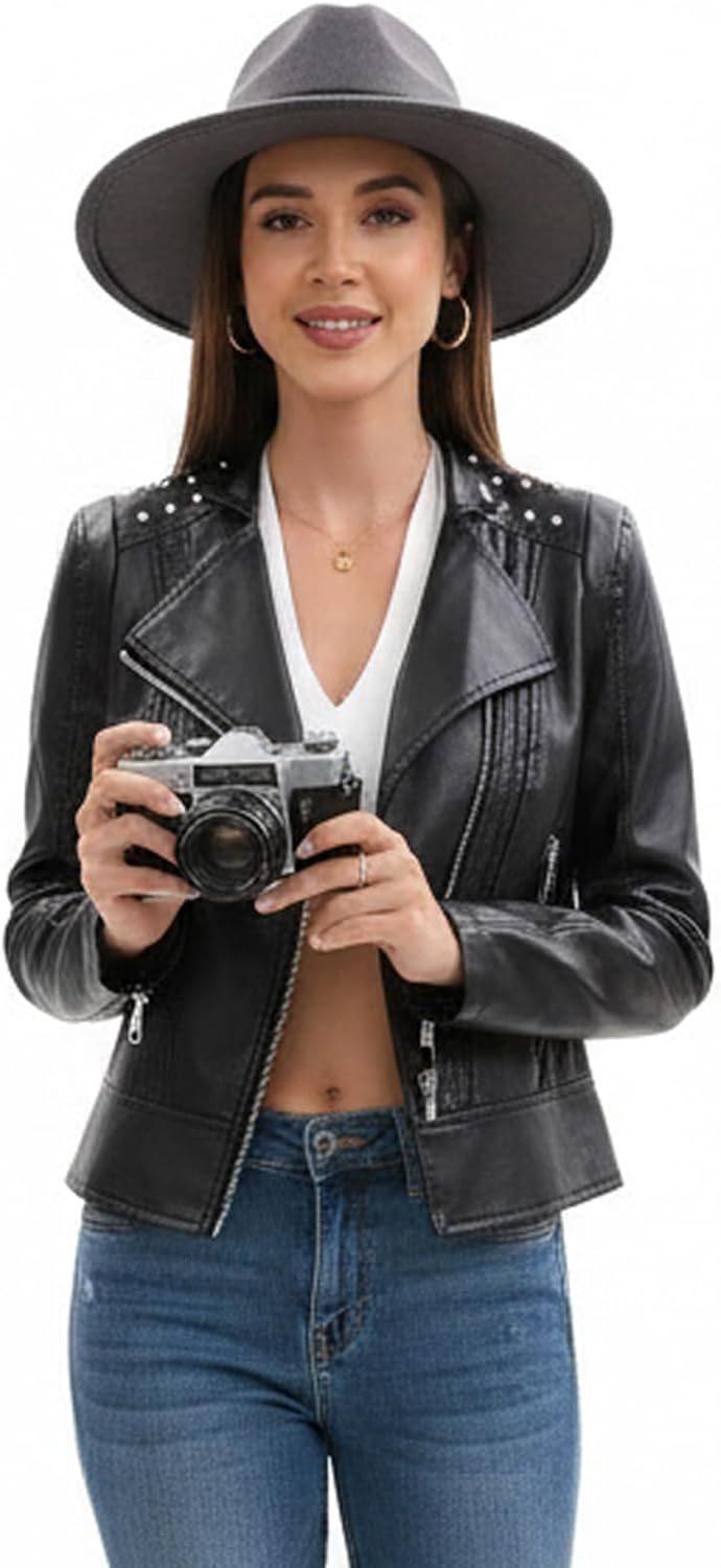 The purple color is pretty and the fit is true. I was going to go up a size but it was sold out. I’m glad I didn’t as this fits great. It doesn’t look like real leather but it’s a nice jacket.